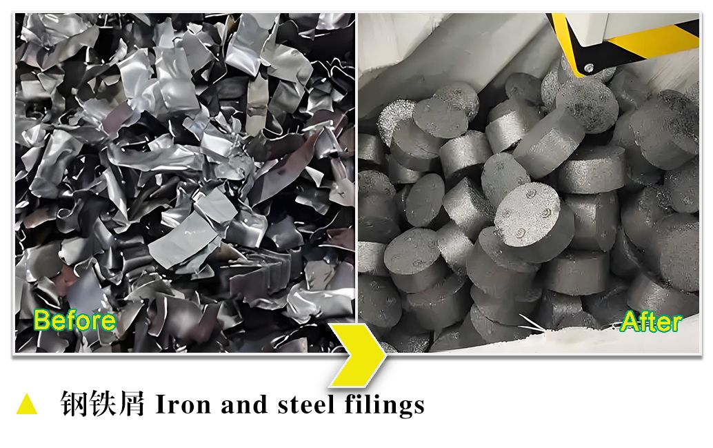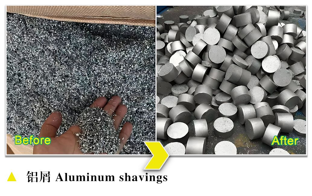 压饼机又称为屑饼机,它由液压站、液压缸、送料模块、模腔、压头等组成。送料模块负责加料,液压缸利用液压站提供的液压力带动压头将物料在模腔内压缩成型,一般是圆饼状。压饼机压力大,压缩面积小,因此可以提供很大的压缩压强,能将物料压缩紧实,饼块体积小、密度高,既提高了物料价值,又减少了存储空间,降低了运输成本和冶炼损耗。压饼同时还能挤出大部分切削液,集中回收和处理后可重复利用,不但减少环境污染,还能节约成本。因此它被广泛用于机加工车间金属屑的处理。